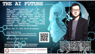 The AI Future Talk by Mr. Ren The AI Future Talk by Mr. Ren Save the date: Mar 17, 2021 at 04:30 PM via Zoom Mr. Ren (Khun Pisuth Ren Huang) is currently working at SCB10X as an Entrepreneur in Residence, focusing in AI and insurtech. He is also a co-founder of OxygenAI, a computer vision B2B startup. He holds two master's degree in Artificial Intelligence: one from UCL/Google DeepMind and the other from Oxford's VGG group. He obtained his bachelor's degree in Engineering from University of Oxford. 23 February 2021