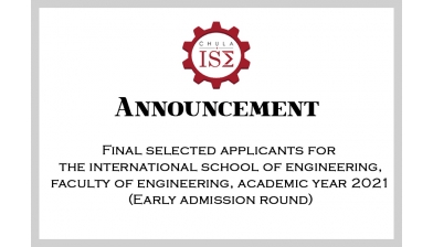 Announcement Final selected applicants for the International School of Engineering Annoucement: Final selected applicants for the international school of engineering,faculty of engineering, academic year 2021(Early admission round) The following lists are the list of final selected applicants for the International School of Engineering, Faculty of Engineering, Academic Year 2021 (Early Admissions). All selected applicants must perform an online enrollment confirmation (round 1) through the TCAS system (https://student.mytcas.com/) during February 22 – 23, 2021. Failure to do so will result in forfeiting the admission to the program for the academic year 2021 (Early Admissions). 21 February 2021