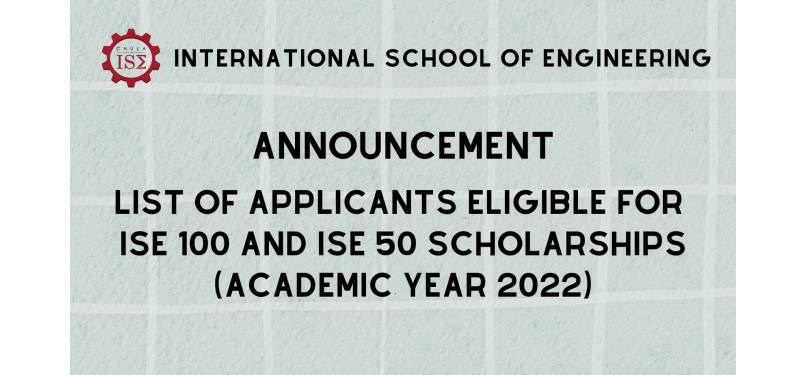 Announcement of International School of Engineering, Faculty of Engineering the Awardee of the ISE Tuition Scholarship for Foreign Students of the Second Round of International Admission 2022 Announcement of International School of Engineering, Faculty of Engineering the Awardee of the ISE Tuition Scholarship for Foreign Students of the Second Round of International Admission 2022 International School of Engineering (ISE) selected a non-Thai nationality with excellent academic performance who passed the criteria of the International Admission 2022 of Chulalongkorn University and the criteria of ISE Scholarship for Foreign Students.