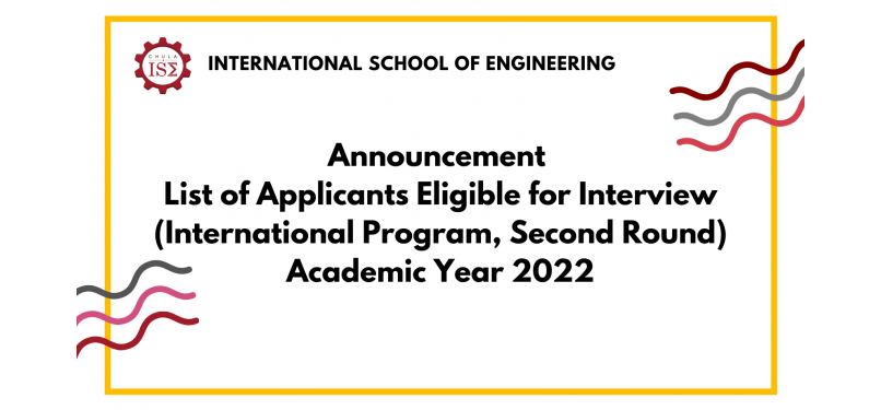 Announcement Final Selected Applications for the International School of Engineering, Academic Year 2022 (Admission Round) The following lists are the list of final selected applicants for the International School of Engineering, Faculty of Engineering, Academic Year 2022 (Admission). All Selected applicants must perform an online enrollment confirmation through the TCAS system (http://student.mytcas.com/) during May 9-10, 2022. Failure to do so will result in forfeiting the admission to the program for the academic year 2022 (Admission).