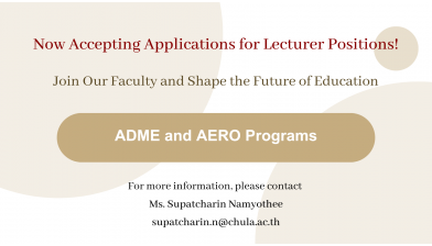 Now Accepting Applications for Lecturer Positions!  1. Full-time Lecturer Positions in the Automotive Design and Manufacturing Engineering (ADME) Qualifications - Ph.D. in Engineering or a closely related field (required) - Ability to teach in a broader range in the curriculum and lab teaching experience (preferred) - Strong record of student supervision and mentorship (preferred) - Ability to work effectively in a multicultural and multi-disciplinary environment - Proven history of collaboration with staff, fellow faculty or industry - Excellent written and verbal communication skills, with proficiency in English - Willingness to shape the future of Automotive Engineering education and research in the region. For more detail about the lecturer positions in ADME program, please visit this link. 2. Full-time Lecturer Positions in the Aerospace Engineering (AERO) Qualifications - Ph.D. in Aerospace Engineering or a closely related field (required). - Strong record of student supervision and mentorship (preferred). - Demonstrated ability to conduct independent research. - Experience in publishing in academic journals. - Industrial or research experience in aerospace (a plus but not mandatory). - Excellent written and verbal communication skills, with proficiency in English. - Ability to work effectively in a multicultural and multi-disciplinary environment. For more detail about the lecturer positions in AERO program, please visit this link. ***Interested applicants are requested to submit a self-introduction email in English, including personal background, educational history, and work experience, to the email address: supatcharin.n@chula.ac.th from October 16 to November 30, 2025.*** If you have any inquiries, please contact Ms. Supatcharin Namyothee via email: supatcharin.n@chula.ac.th   16 October 2025