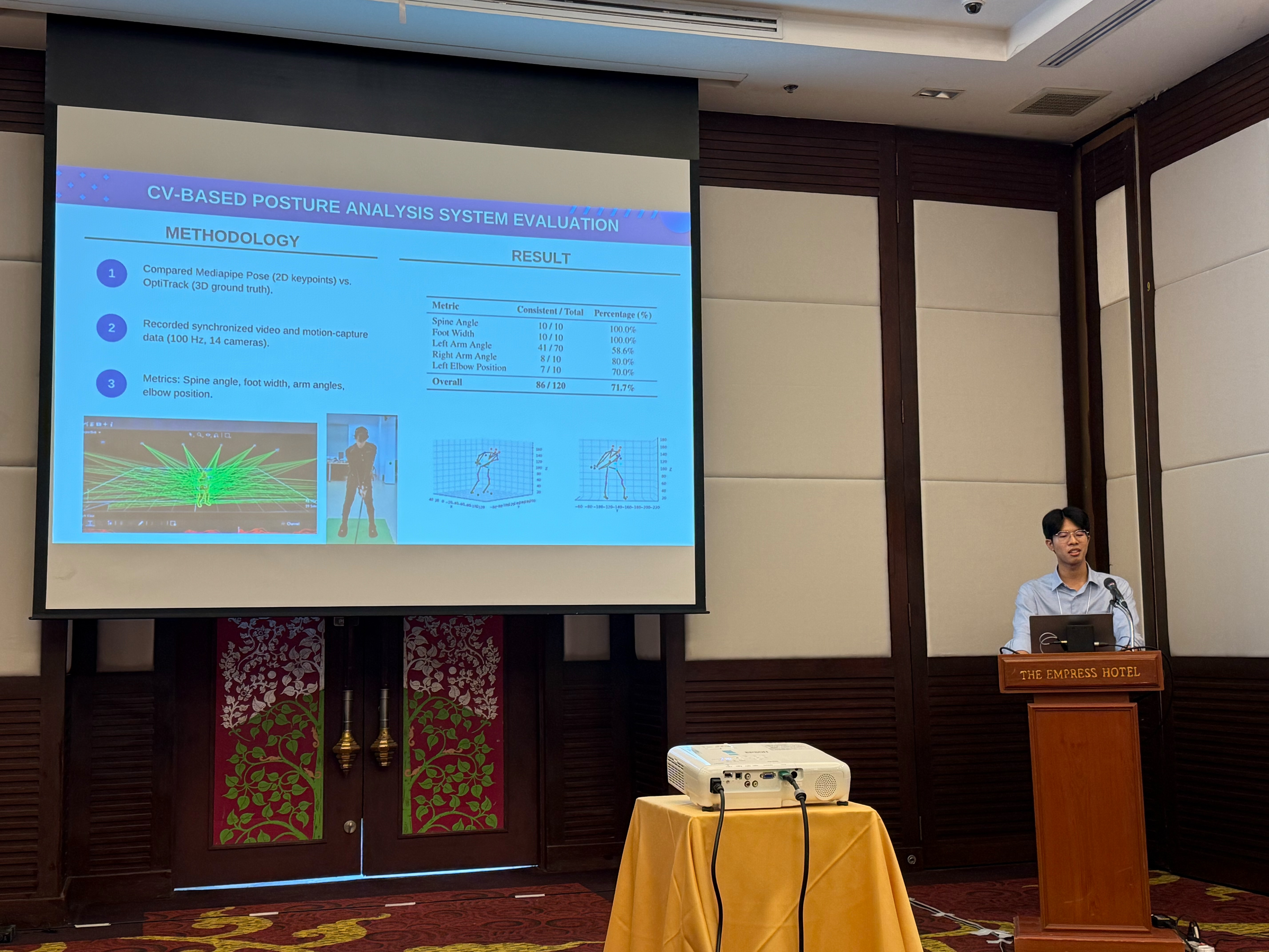 The paper entitled “Real-time Computer Vision Feedback System for Golf Swing Posture Analysis Using Pose Estimation and LLMs” was presented by Mr. Suppakit Laomahamek, Mr. Trivit Chaiyaraks Worakulpisut, Ms. Chinnapat Chaimongkoltrakul, and Mr. Dissakorn Plubpla. This work was supervised by Assoc. Prof. Ronnapee Chaichaowarat, Ph.D.