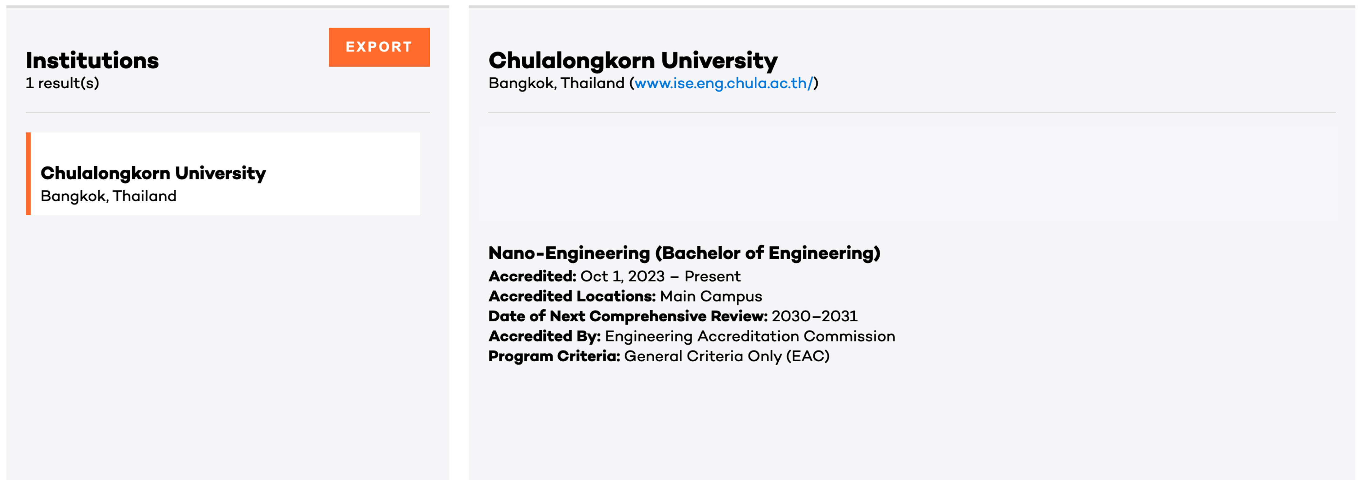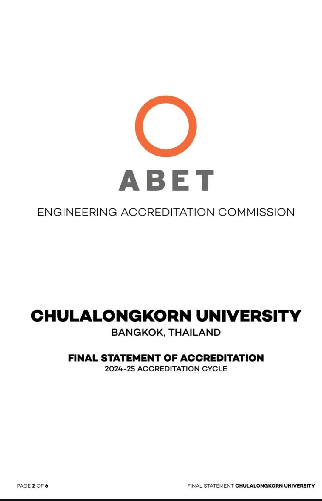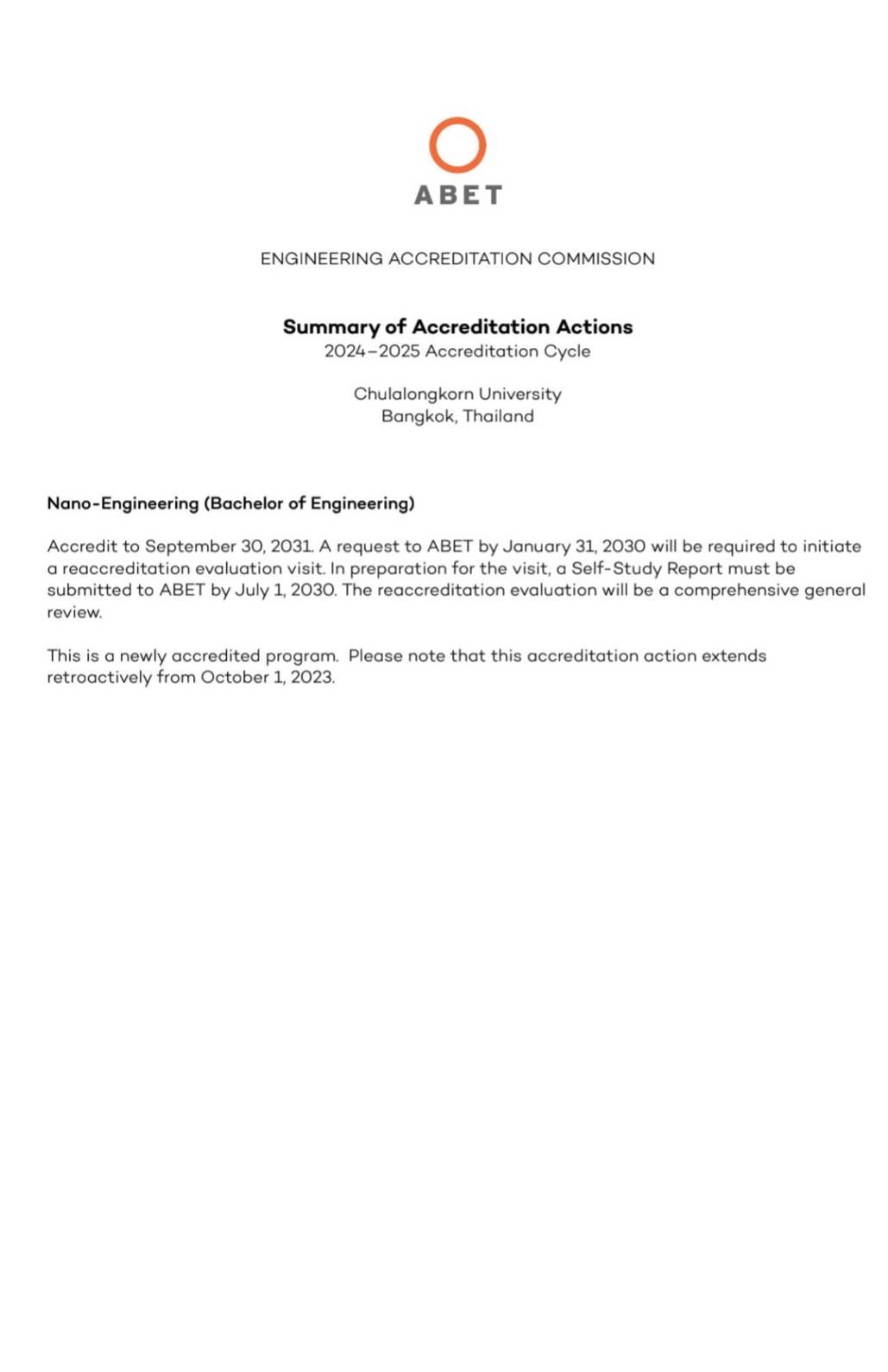 The Nano-Engineering Program, International School of Engineering, Faculty of Engineering, Chulalongkorn University, has been accredited by ABET (Accreditation Board for Engineering and Technology, USA) for a period of 6 years.