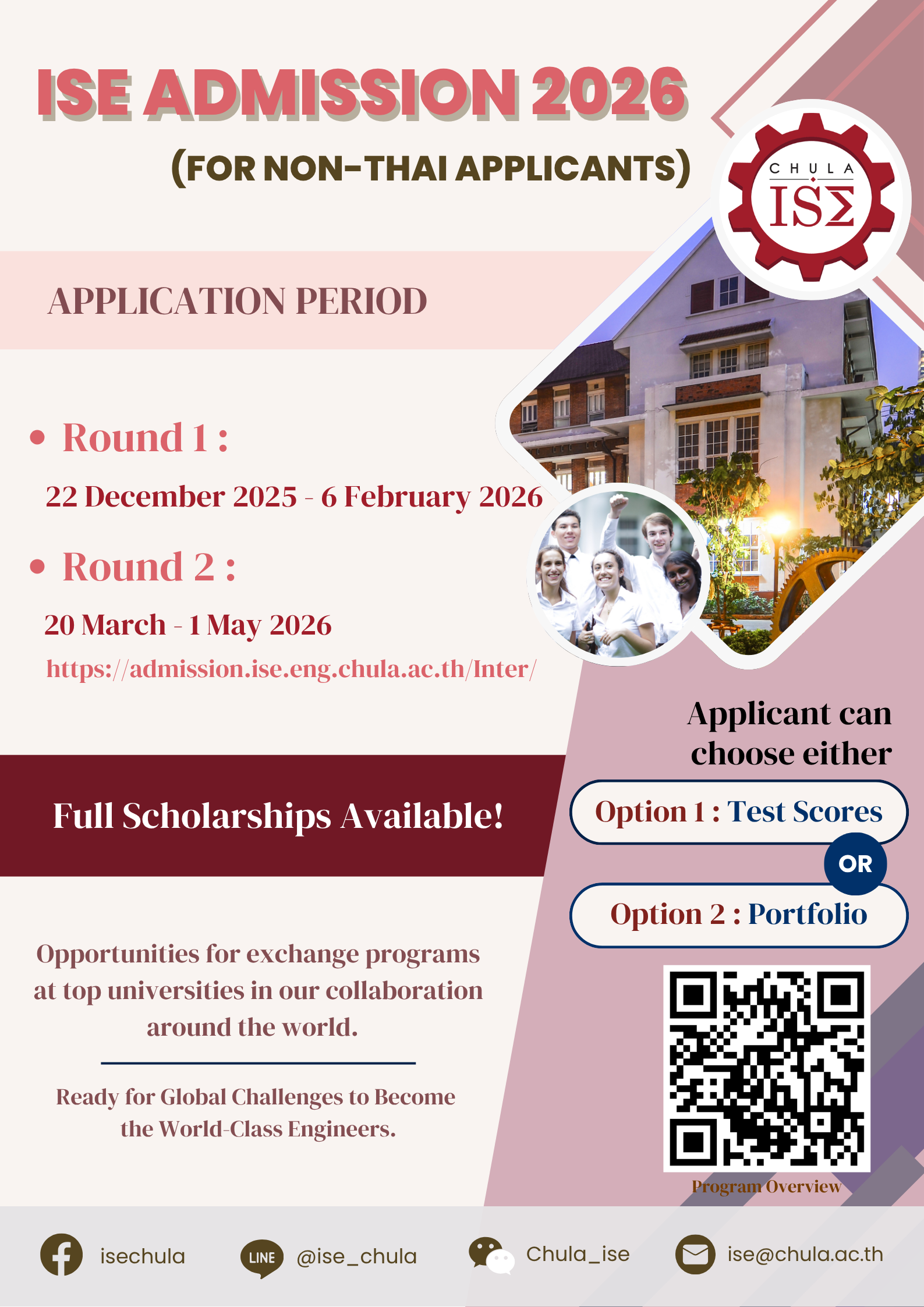 The Electrical Engineering Department (CUEE) in collaboration with the International School of Engineering (ISE) has launched a new bachelor’s degree program in semiconductor engineering (SEMI). This program focuses on various aspects of semiconductor technology, from designing advanced semiconductor devices, circuits, and systems, to fabricating, testing, prototyping, employing, and optimizing them for 21st-century applications that include edge computing, cloud-based applications, electric vehicles (EV), and generative AI. We will start accepting applications from Thai applicants during the admission round from February 26 to March 26, 2025. There will be no early admission round for Thai applicants. International applicants can apply to our program during the first round from December 25, 2024 to February 5, 2025. However, if the announced number of admitted international applicants is not met in the first round, the second round of application for international applicants will take place from March 20 to May 2, 2025. The first class will begin in August 2025. For more information, please visit http://www.ise.eng.chula.ac.th/academics/semi/info. Semiconductor Engineering Program Contacts Tel: 02-218-6495