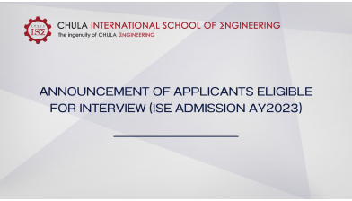 Applicants can check your application status and your interview schedule through ISE Online Admission 2023 (Thai): https://admission.ise.eng.chula.ac.th Applicant's Manual Applicant’s manual for ISE Admission 2023 Online Interview (Test Score Option) Dates and Times Date: Friday, April 7, 2023 Time: Morning Session (AM) 9:00 – 12.00 (Register 8:50) *Note that you must standby in the Microsoft Teams since the beginning of each session. *Interview Dress Code: Student Uniform Only *Prepare and show the original national ID card to the committee when video calling