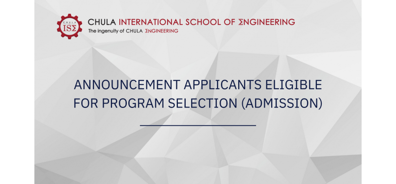 Applicants can check your application status through ISE Online Admission 2023: https://admission.ise.eng.chula.ac.th/Inter Applicant's manual Applicant’s manual for ISE International Admission: Program Selection 2023 The program selection must be done online from Friday February 24, 2023, from 8.30 a.m. to 4.00 p.m. at https://admission.ise.eng.chula.ac.th/Inter