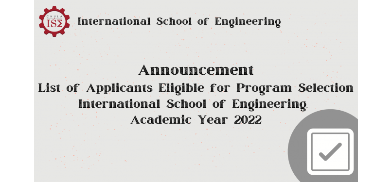 Scholarship Announcement Announcement Faculty of Engineering, Chulalongkorn University ISE Scholarship for Foreign Students of International Admission 2022 Apply Now! ISE Online Admission 2022/2 (Inter): https://admission.ise.eng.chula.ac.th/Inter/ Application Period: 4 March - 3 May 2022 by 16:00 hr Announcement of Interviewees: 9 May 2022 Interview Period: 12 May 2022 Announcement of Qualified Candidates: 20 May 2022 Admission Announcement Chulalongkorn University Announcement Regarding Applications for Students in the Bachelor of Engineering (International Program), Faculty of Engineering for Academic Year 2022 (International Admission) Announcement Avaiilable Seats for the Second Round of International Admission (International Program), Faculty of Engineering for Academic Year 2022 Survey of Chula ISE International Admission AY2022 Round 2 (Online CU-AAT and CU-ATS Test) for Foreign Applicants Click >> https://forms.gle/96VTDFKL2cqczqNN6 Application options (Choose one only.) Option 1: Test Scores Admission Criteria AY2022 Option 2: Portfolio Portfolio Evaluation Criteria Applicants' Manuals Applicant’s manual for ISE, Chulalongkorn University Option 1: Test Scores Applicant’s manual for ISE, Chulalongkorn University Option 2: Portfolio For the CU Academic Test Center website, please visit https://hsces.atc.chula.ac.th/ Q&A Q&A INTERNATIONAL ADMISSION ACADEMIC YEAR 2022