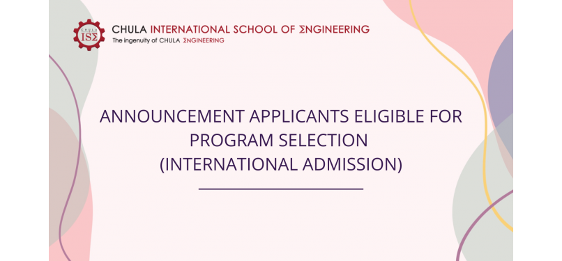 Applicants can check your application status through ISE Online Admission 2023: https://admission.ise.eng.chula.ac.th Note* Please use your Application ID as the username when logging in to the system. Chulalongkorn University would like to announce the list of successful applicants who are eligible to enroll in the Bachelor Degree of Engineering (International program), as per the list attached to this announcement.