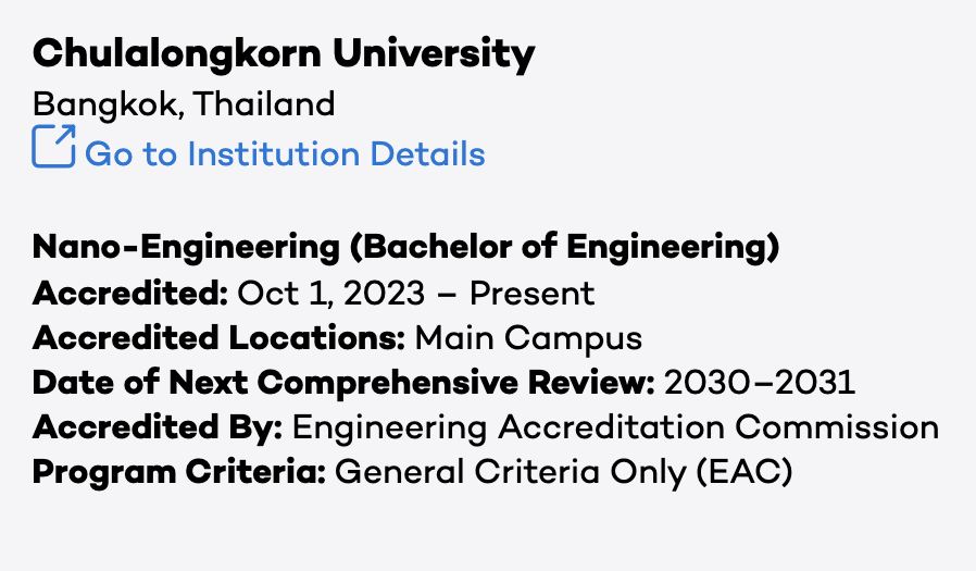 The Nano-Engineering Program, International School of Engineering, Faculty of Engineering, Chulalongkorn University, has been accredited by ABET (Accreditation Board for Engineering and Technology, USA) for a period of 6 years.