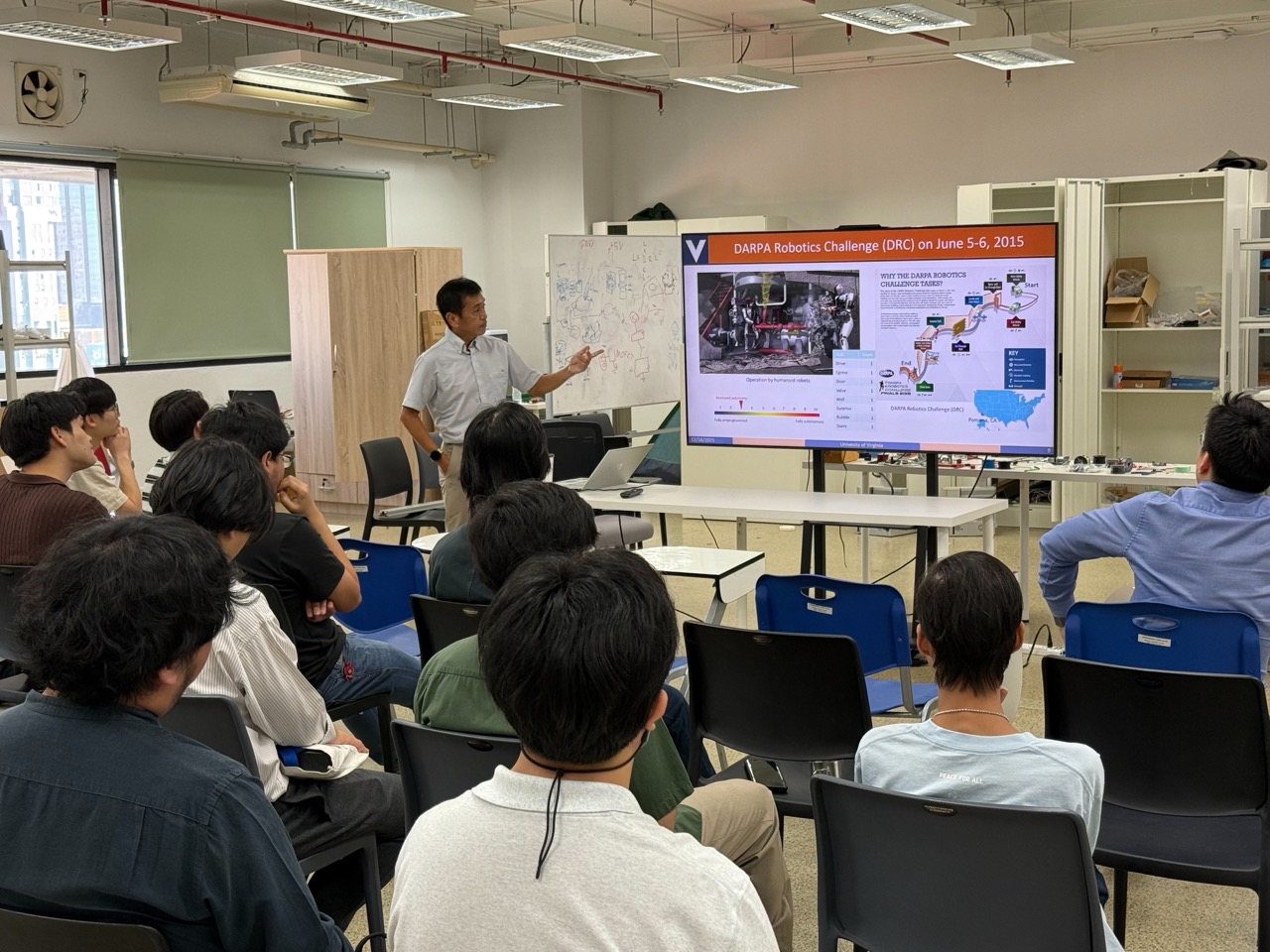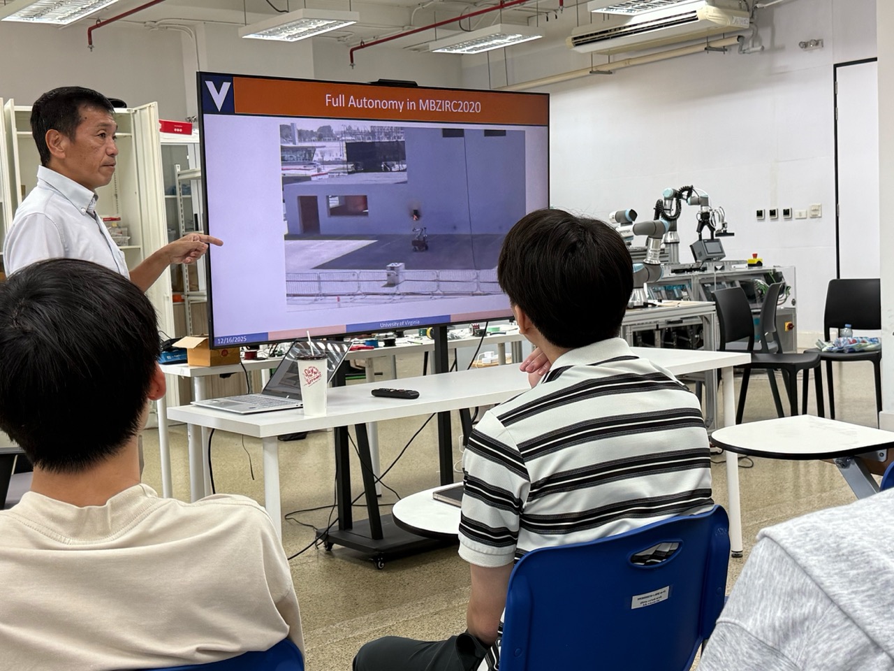 On Tuesday, December 16, 2025, the ISE Special Lecture on Robotics was honored to host Prof. Tomonari Furukawa, Professor and Zinn Faculty Scholar at the University of Virginia, and Honorary Professor at Chulalongkorn University, as the distinguished guest speaker. Prof. Furukawa shared research findings from the VICTOR Laboratory covering a wide range of topics, including fully autonomous rescue robots, humanoid robots, aerial–ground robot collaboration, human front-following robots, state estimation under extreme acceleration, and his experiences leading teams in several renowned international competitions. These included Virginia Tech’s Team VALOR in the DARPA Robotics Challenge (2015) and Team VICTOR in the Mohamed Bin Zayed International Robotics Challenge (MBZIRC) in 2017 and 2020. The session was organized by Assoc. Prof. Ronnapee Chaichaowarat, Ph.D., at ISE Robotics Lab.